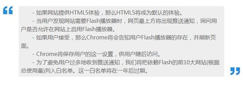 從2016年第四季度開始,谷歌計劃只為仍依賴Flash插件的前10大域名提供默認(rèn)的Flash支持。只要網(wǎng)站提供HTML5體驗,那么Chrome就會展示這樣的體驗。而如果網(wǎng)站必須使用Flash插件,那么用戶將被詢問,是否允許Flash插件的運行。